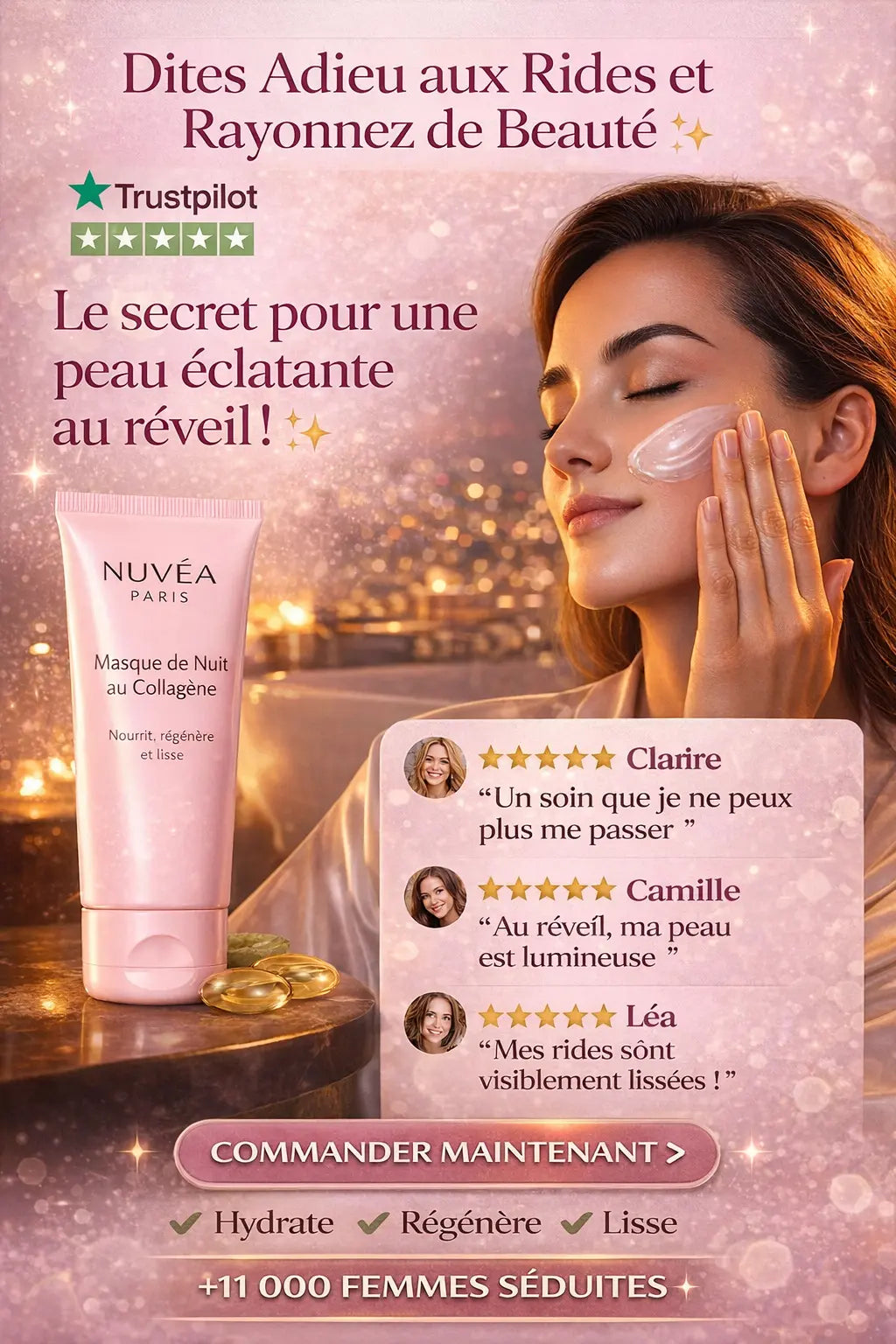 Ici, nous ne proposons pas seulement un masque de nuit, mais une véritable transformation de la peau. Sa formule experte hydrate intensément et repulpe la peau pour lisser visiblement rides et ridules. Enrichi en bio-collagène, acide hyaluronique et niacinamide, ce soin aide à restaurer l’élasticité, améliorer l’éclat et la fermeté du teint, tout en contribuant à atténuer les taches pigmentaires. Déjà adopté par plus de 11 500 clientes, avec des résultats visibles dès les premières 24 heures.